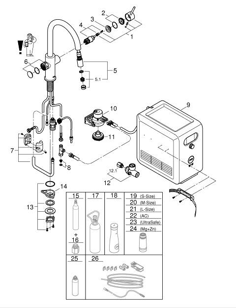 - GROHE Blue filter, CO₂ bottle and cleaning cartridge are not included and have to be ordered separately